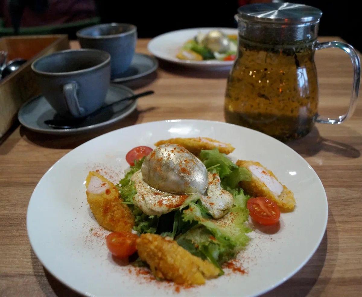 Меню обеда: салат удмуртский с золотым яйцом, суп «зазег шыд» (суп с уткой), телятина по-можгински, кожыпог (сырно-нутовые шарики), травяной чай «удмуртский сбор».
