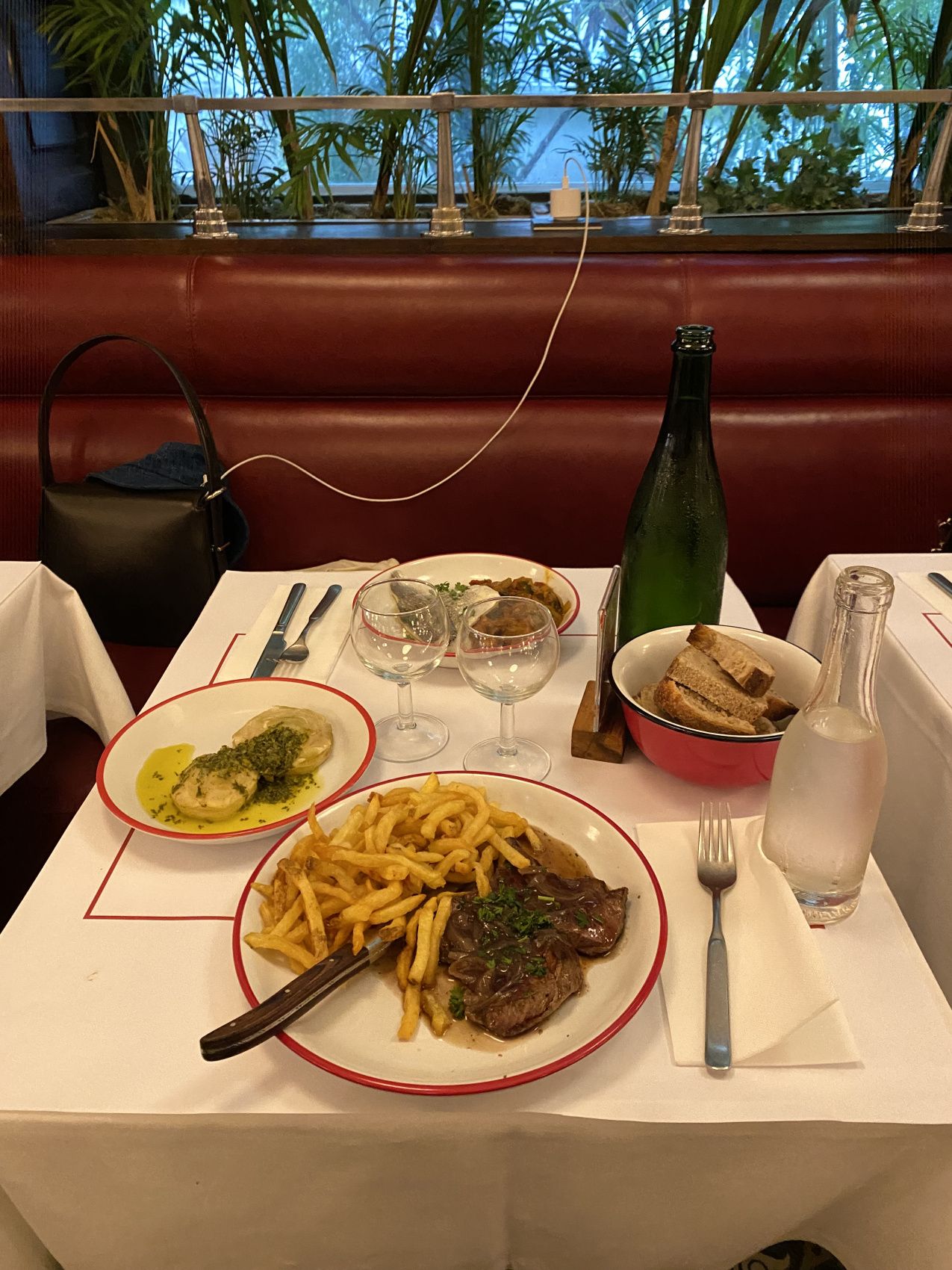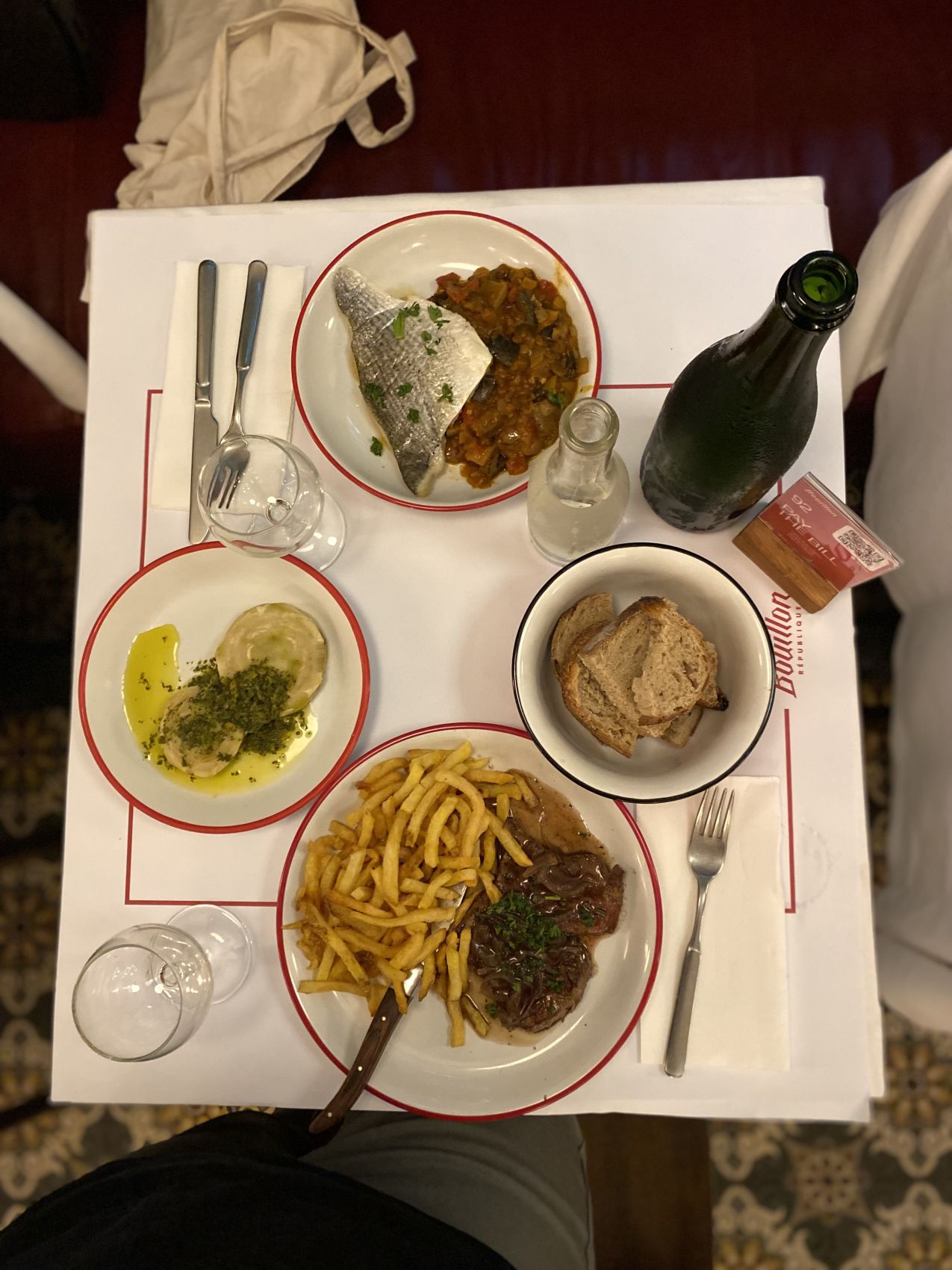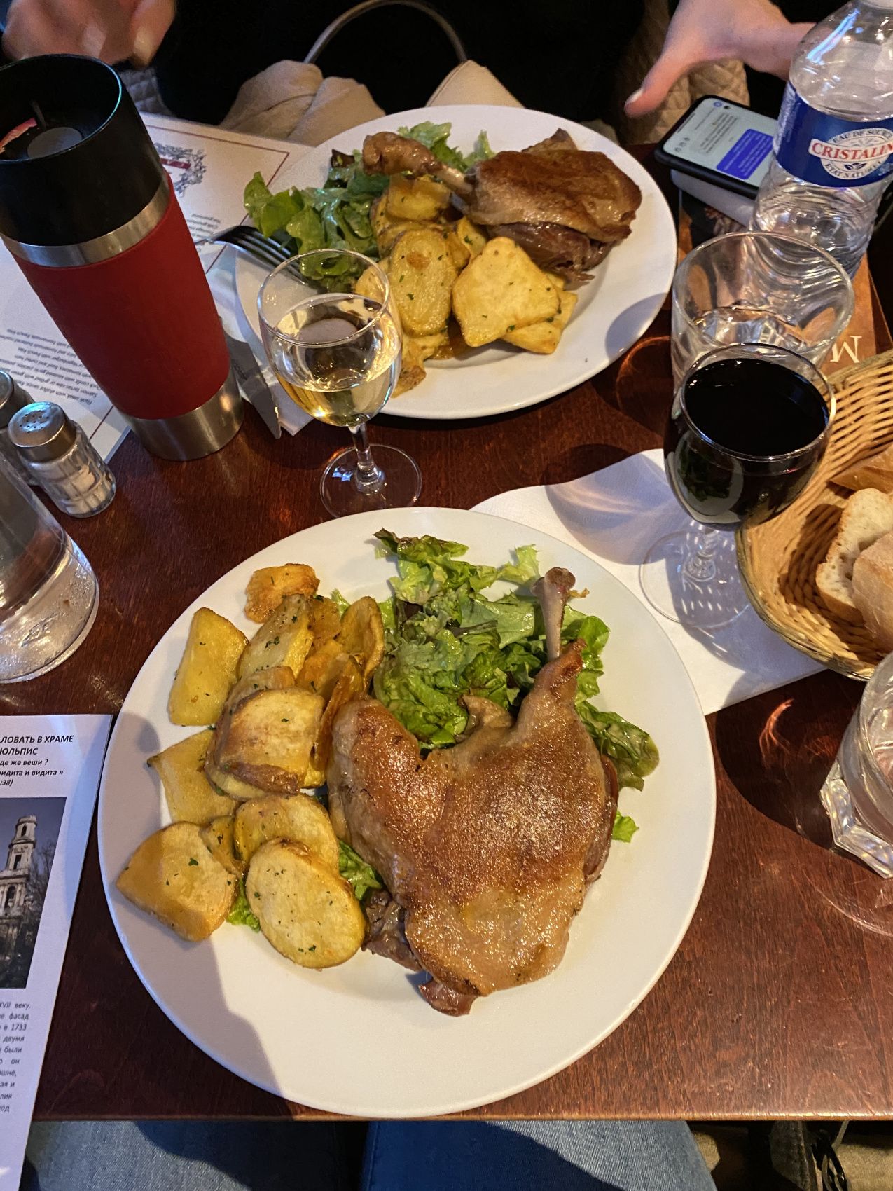 Вечером французский ужин где будет предложено блюдо на выбор с гарниром, багет, вода и вино.