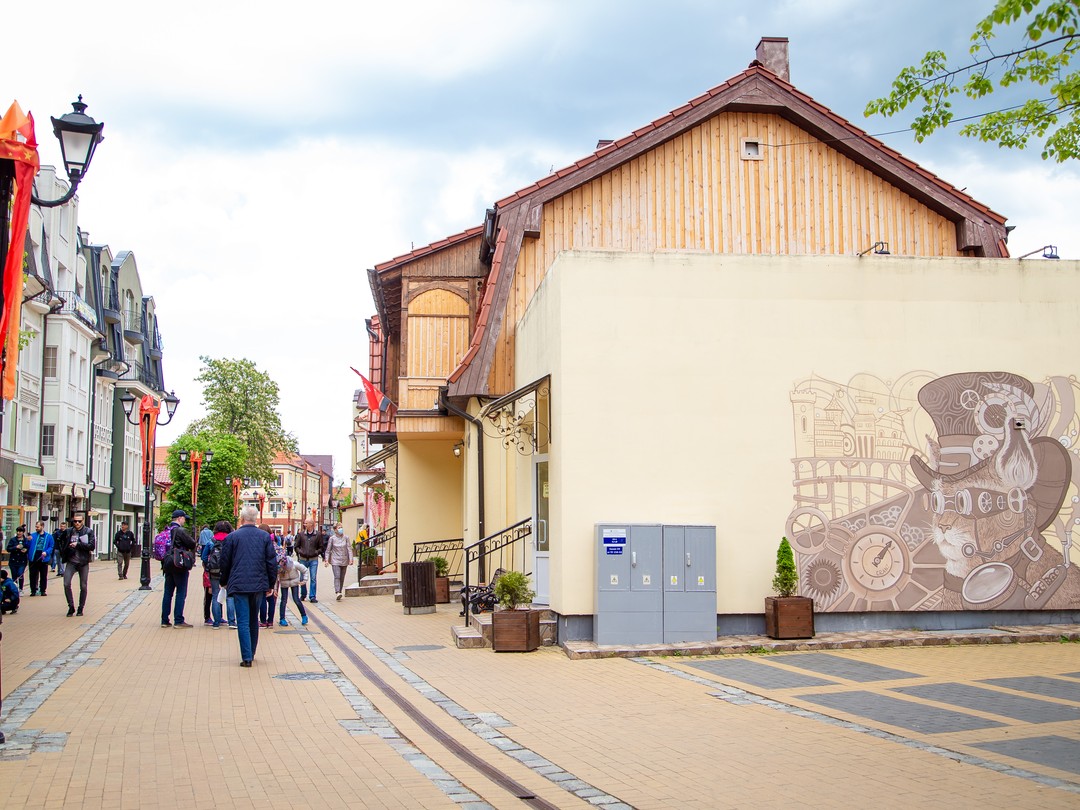 Дальше отправимся в Зеленоградск — пляжный курорт, раньше носивший название Кранц. Он официально признан городом котов: здесь есть домики для животных, автоматы с кормом, светофор с кошками, вместо человечков, памятники и изображения на стенах и плакатах и множество самих пушистых горожан.
