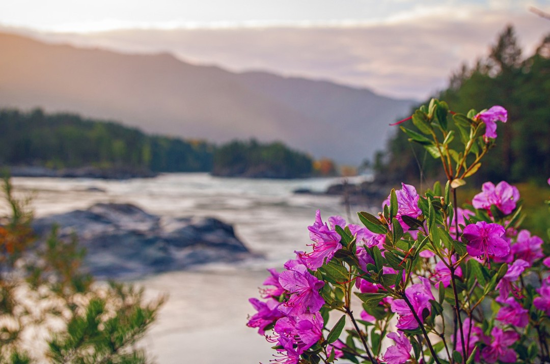 Пройдёмся по висячему Ороктойскому мосту над самым глубоким участком Катуни. Сделаем остановки в живописных местах с цветущим маральником, который ещё именуют алтайской сакурой, чтобы сфотографироваться на фоне фиолетовой дымки.