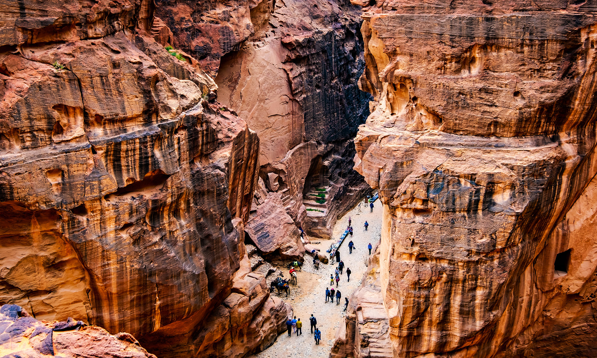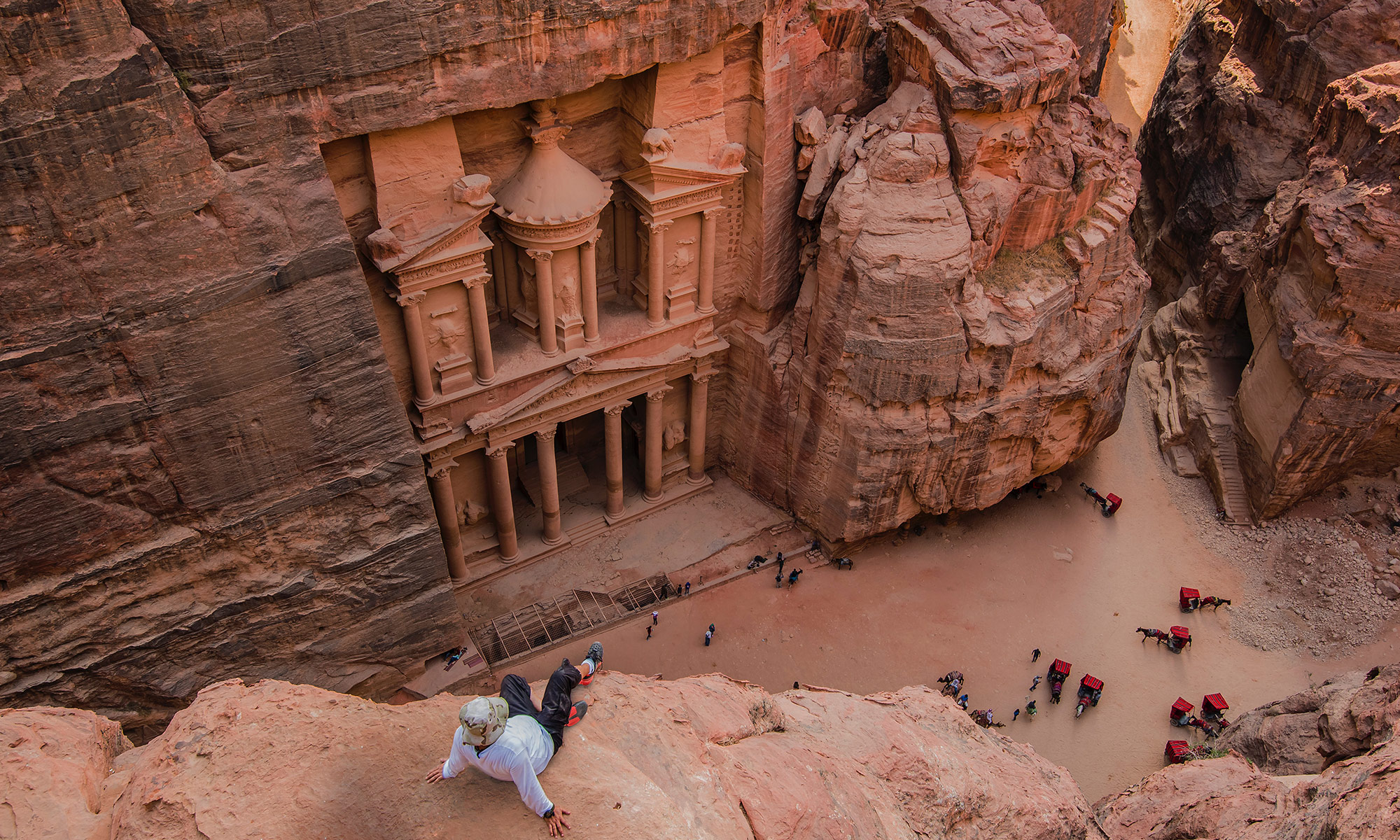 Начните с входа через Сик, длинное и извилистое узкое ущелье, окруженное с обеих сторон высокими скалами высотой 80 м, которые приведут вас к захватывающему дух фасаду Сокровищницы (Аль-Хазне). Сокровищница, возможно, является одним из самых знаковых чудес Иордании и была показана в фильме Индиана Джонс и последний крестовый поход. Проведите некоторое время, исследуя основные достопримечательности города, включая Римский театр, Улицу фасадов и Королевские гробницы.