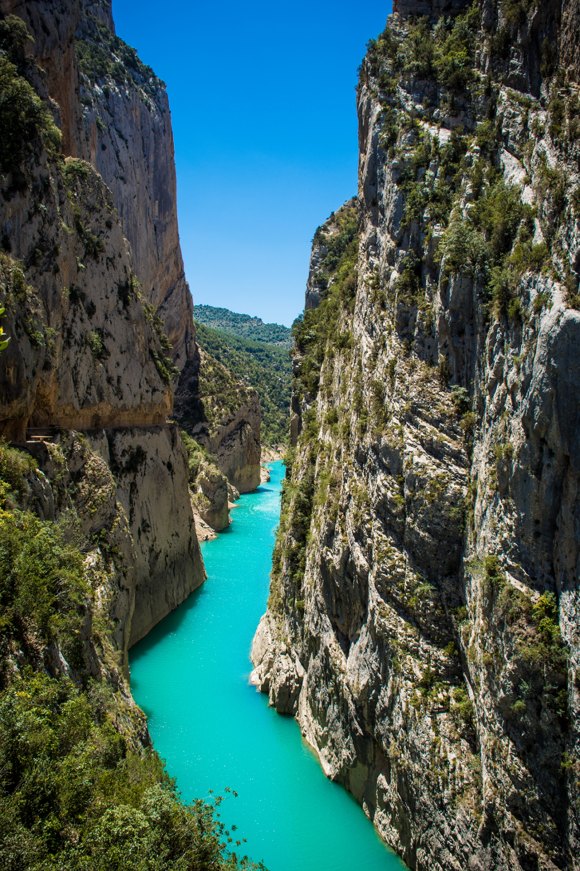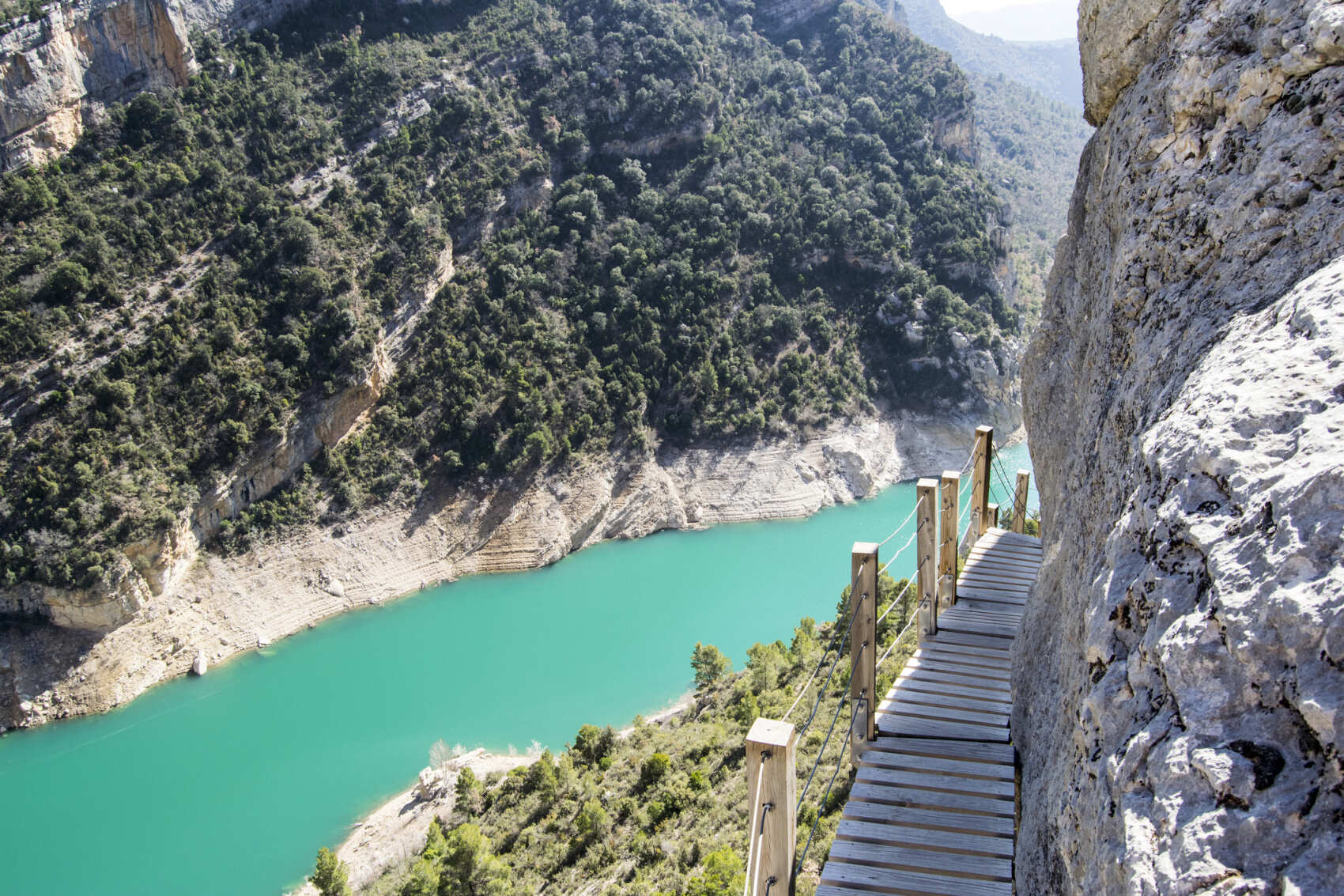 Этот мост уже пересекает саму реку, и по нему мы из Каталонии попадаем в Арагон, другую автономию (а когда-то – отдельное королевство). Мост довольно длинный – 35 метров – и висит на высоте примерно 40 метров над рекой. Здесь часто бывает ветренно, что добавляет острых ощущений при переходе. Для туристов это не просто переход, а ключевой момент маршрута — граница между двумя мирами, двумя пейзажами и двумя подходами к дикой природе.