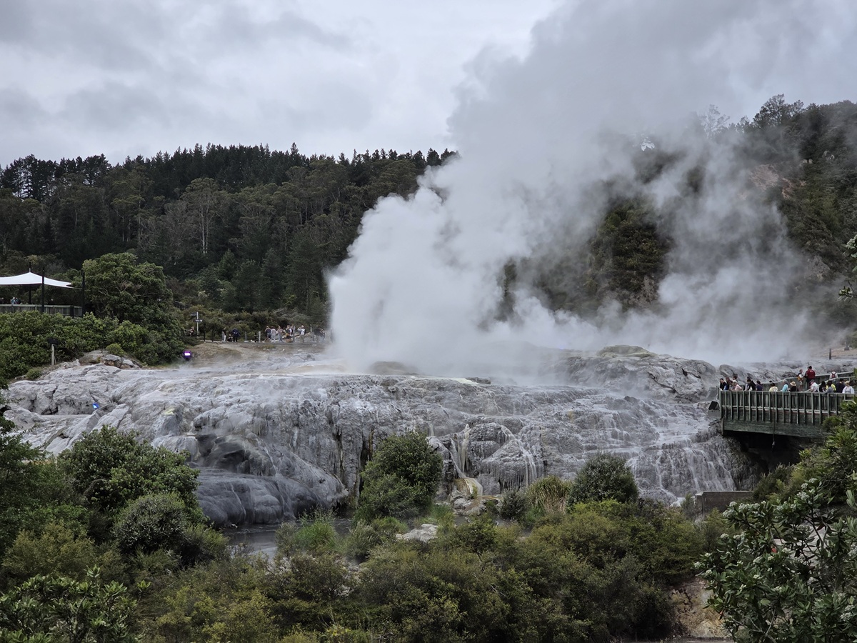 На одной террасе расположено сразу три гейзера. Кроме Похуту, здесь еще можно увидеть гейзер Принц Уэльский и гейзер Керуру. Похуту извергается нестабильно, примерно раз в час, в утренние часы ведет себя активнее. Высота извержения составляет до 30 метров. На языке маори Похуту означает взрыв или большой всплеск. Кстати, маори прекрасно приспособились к вулканическому нраву острова: в щелочных водах они замачивали грязную одежду, которую потом остается только ополоснуть, а в кипящих котлах варили еду.