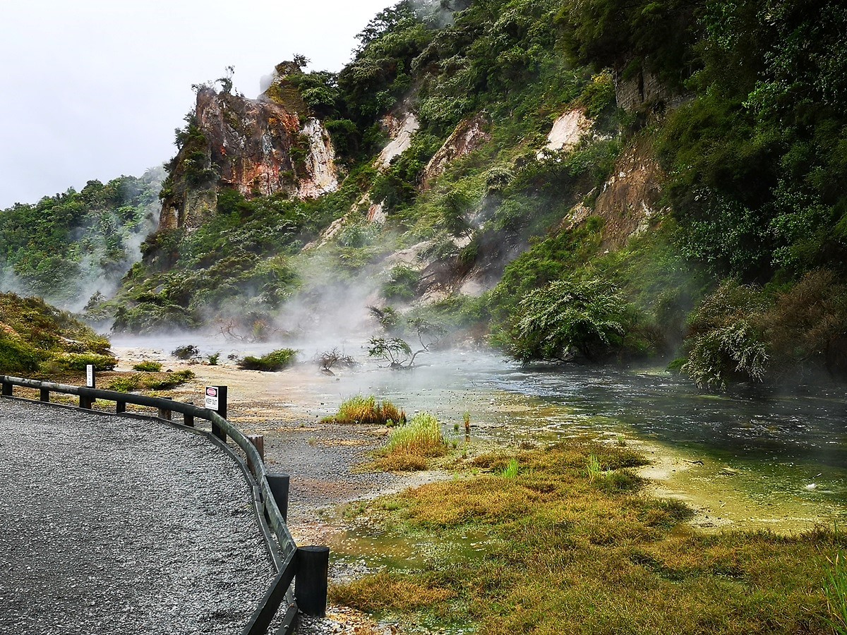 Геотермальный парк Вай-О-Тапу, купание в горячей речке, геотермальный парк Оракей Корако, водопад Хука. Ночь в Таупо.