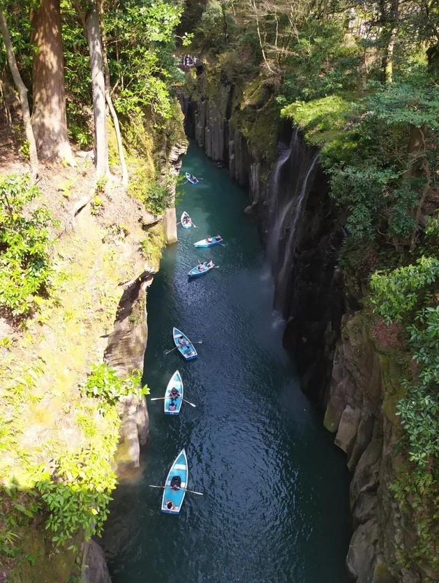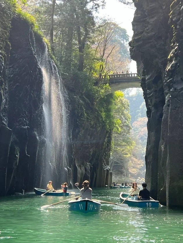 Сегодня продолжим исследовать примечательные места острова Кюсю. Побываем в ущелье Такатихо, стены которого образованы вулканическими базальтовыми породами и напоминают соединённые столбы, уходящие вверх на 100 метров над бирюзовыми водами реки Гокасе. Полюбуемся водопадом Манаи.