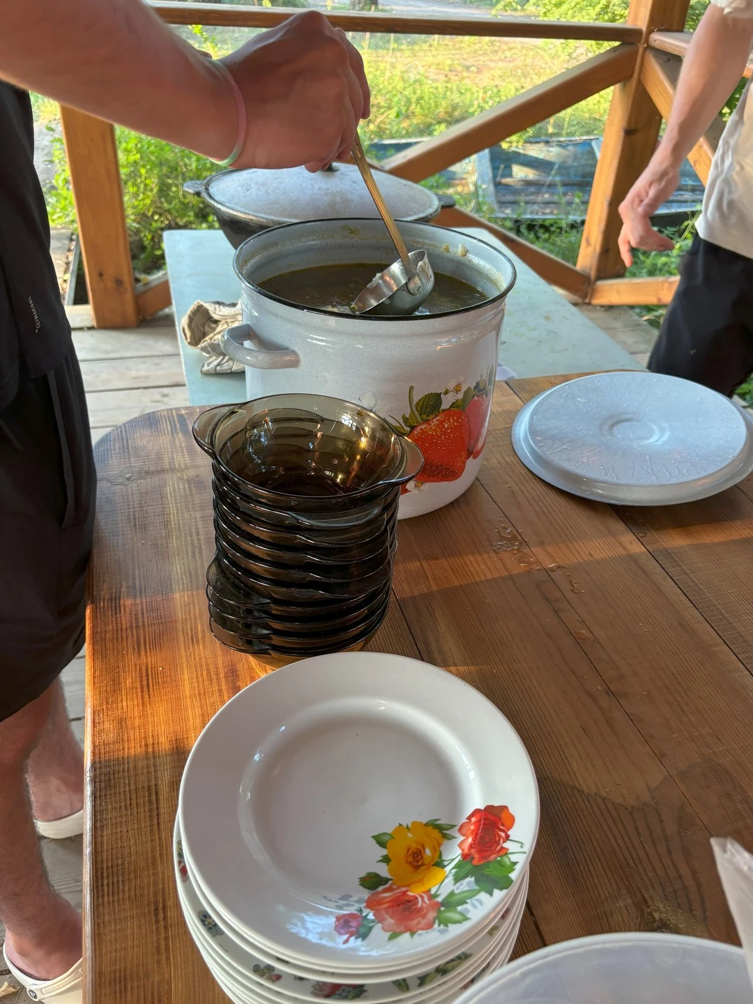 В 19:00 для нас подадут ужин, который пройдёт в беседке с панорамным видом на реку или в гостиной дома (зависит от погоды). В меню: мясо с гарниром, деревенский салат, чай и компот. Желающие смогут бесплатно воспользоваться мангалом рядом с беседкой.