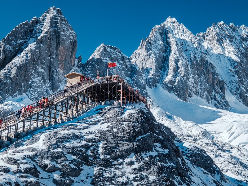 Утро начнётся с поездки к горе Нефритового дракона высотой 5596 метров. Мы посмотрим шоу Impression Lijiang — грандиозное представление на фоне гор. Затем поднимемся по канатной дороге на Еловый луг, а оттуда — в долину Голубой Луны. Кульминацией дня станет подъём к леднику: по канатной дороге мы достигнем высоты 4506 метров, а затем пройдём по деревянной дорожке до ледяных склонов. Весной на вершине бывает холодно и ветрено — обязательно возьмите тёплую одежду.